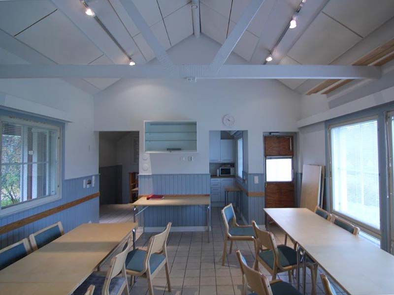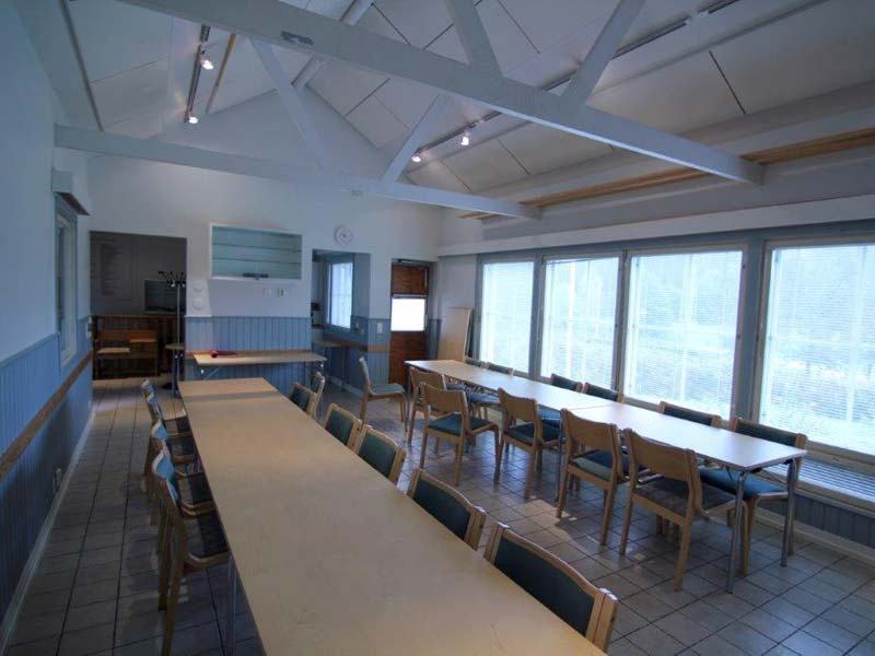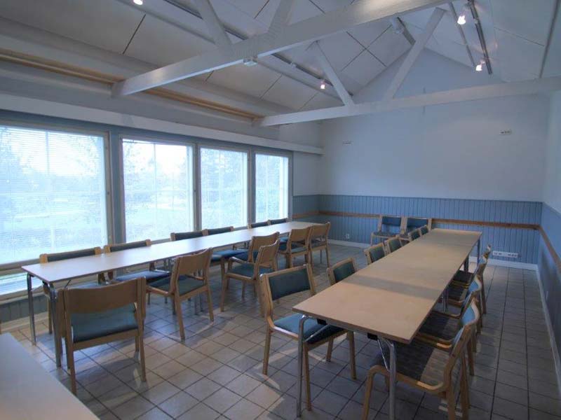 Tässä 85 neliömetrin kokoisen rakennuksen yläkerrassa on 40 henkilön neuvottelutila ja keittö.